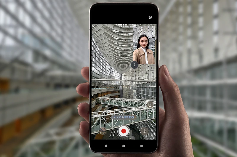 メインカメラとフロントカメラの映像を同時に記録し、ひとつの動画として撮影・保存が可能。撮影者の表情と風景を一緒に残したり、複数人での会話の様子を臨場感そのままに記録するなど、さまざまなシーンで活用できます。